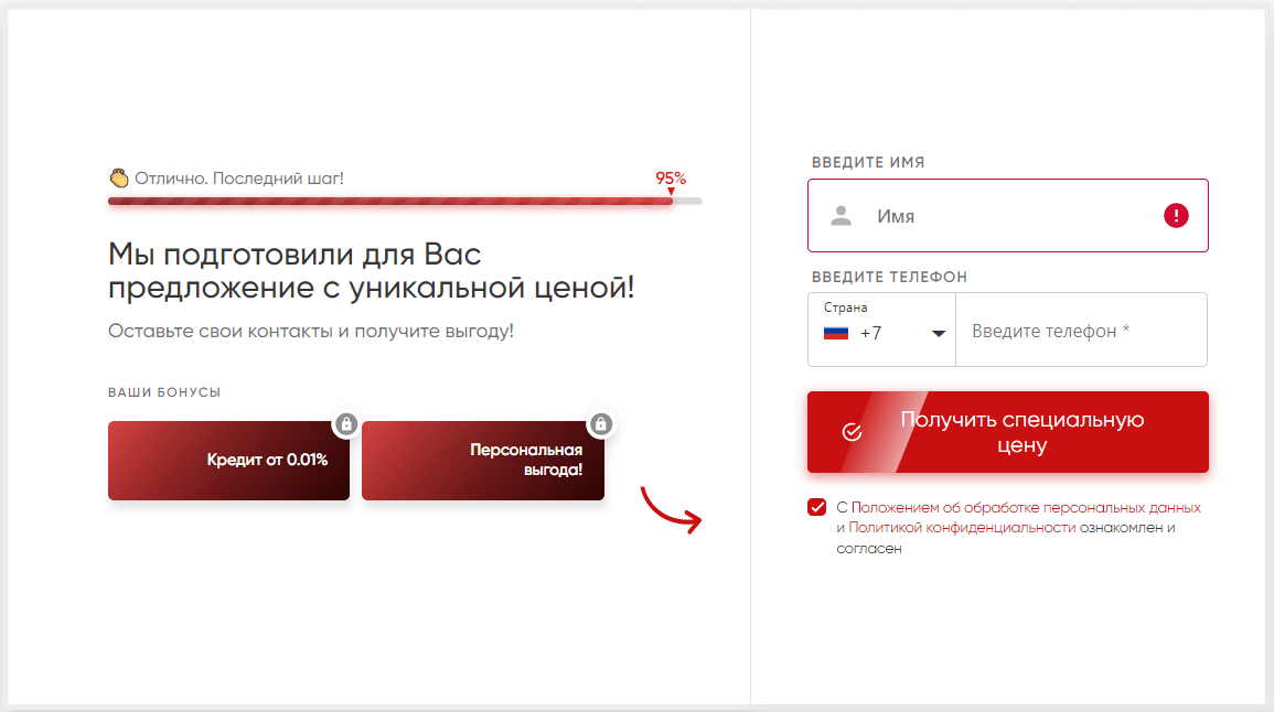 Клиент предоставил нам одностраничный лендинг для рекламы. Дополнительно к нему мы создали квиз для сбора заявок. Такой формат помогает выделиться среди конкурентов и повысить вовлеченность пользователя, а также генерирует лиды быстрее, чем стандартная посадочная страница. Квиз содержит всего 4 вопроса, чтобы пользователь не успел от него устать и с большей вероятностью заполнил форму до конца.