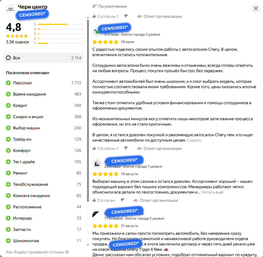 Тексты для отзывов составляли на основе обратной связи от покупателей, которую собирает клиент. Мы сохранили авторский стиль, возможные опечатки, смайлы, знаки препинания и уникальный характер каждого отзыва: этот написала молодая девушка, другой — глава большой семьи, третий — молодой дерзкий парень автолюбитель. Тексты намеренно не редактировали до «идеально вылизанных»: в них сохраняли описание как плюсов, так и незначительных минусов дилерского центра, на которые могли обратить внимание посетители. Такой подход позволил сделать карточки активными, «живыми» и привлекательными, но не вызывающими подозрений у модераторов площадок, что в итоге сформировало надежную основу для роста лояльности и конверсии аудитории.