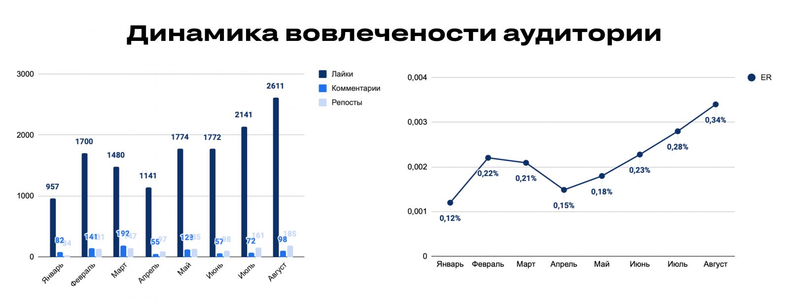 Вовлеченность также росла — за период с января по август показатель ER увеличился почти втрое (с 0,12% до 0,34%). Количество лайков, комментариев и репостов последовательно возрастало: если в январе публикации собирали 957 лайков, то уже в августе — 2 611. Это говорит о заметном усилении интереса к контенту и расширении охвата.