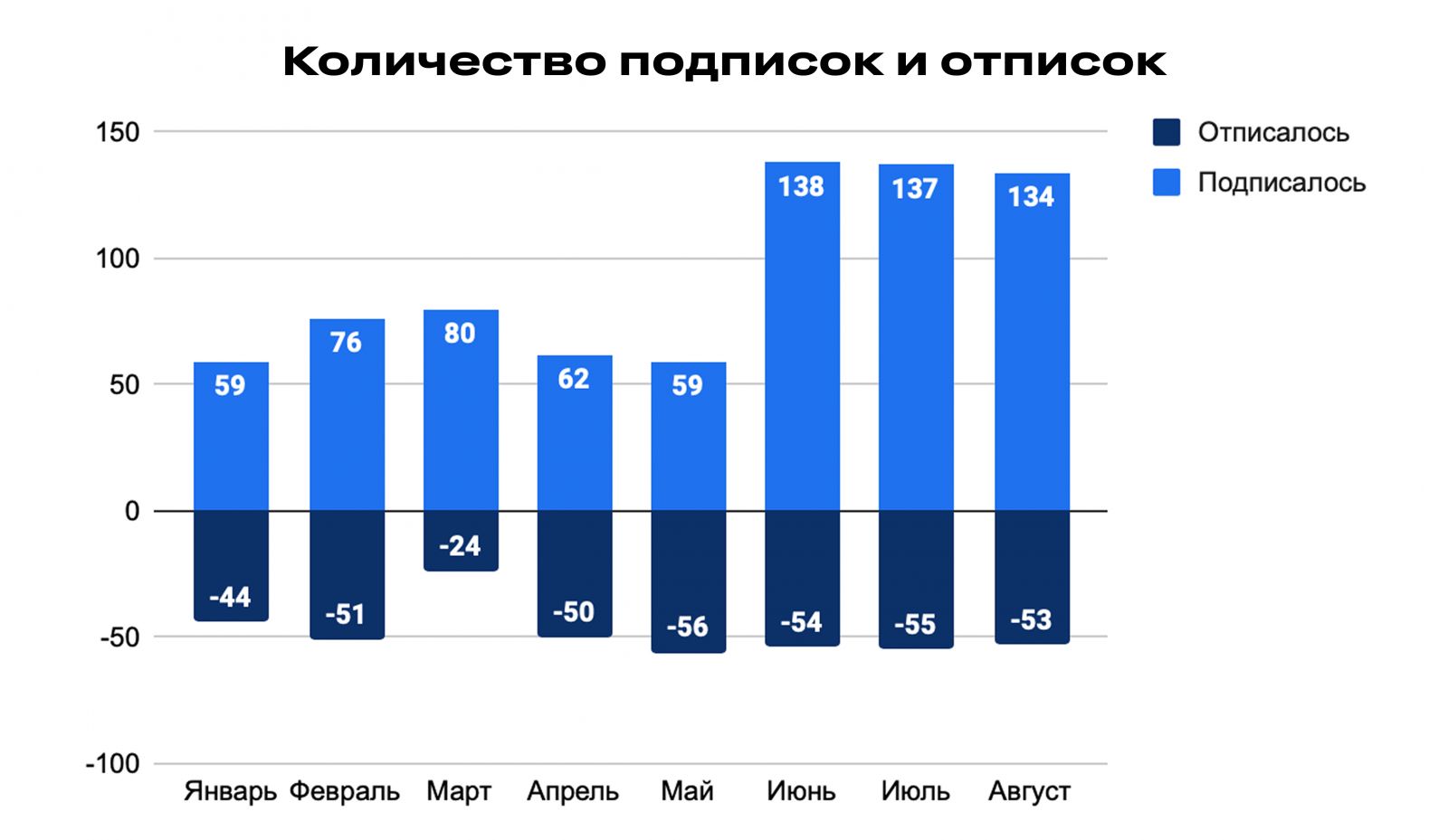 В первой половине года динамика подписок оставалась слабой и неравномерной, а в мае практически сошла на нет. Мы не сдавались, регулярно оптимизировали контент, и уже с июня ситуация изменилась: число новых подписчиков резко выросло при стабильном уровне отписок, что обеспечило чистый прирост более 80 человек ежемесячно. Пиковым месяцем стал июнь, когда при 138 новых подписках и 54 отписках чистый прирост составил рекордные +84 подписчика. Такой результат свидетельствует о росте интереса к контенту и устойчивом положительном тренде в развитии аудитории.