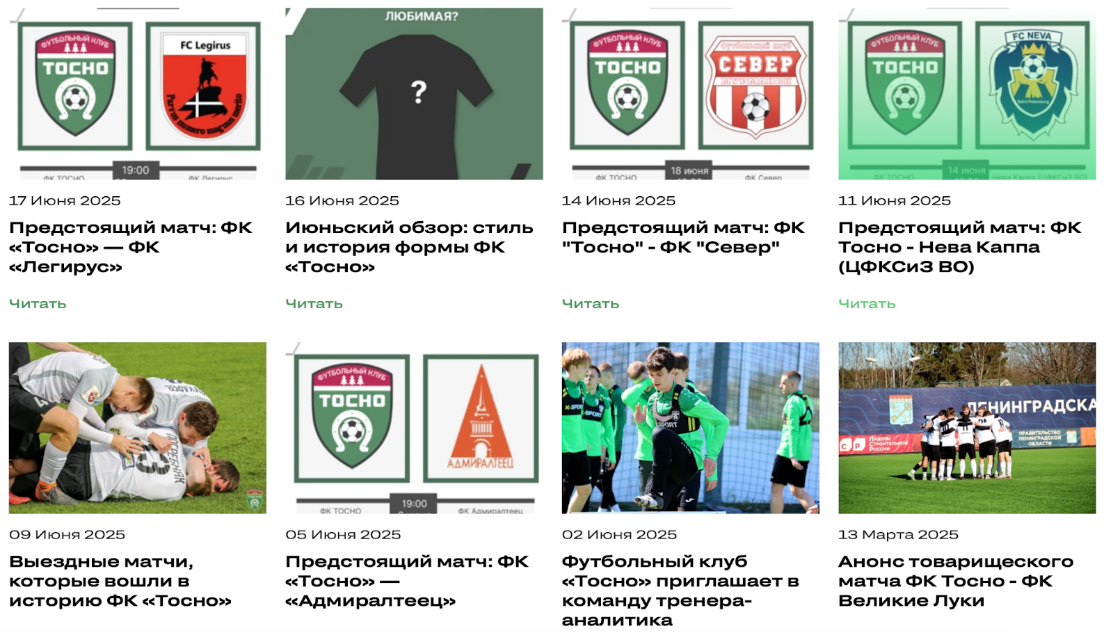 Чтобы оценить сайт в контексте рынка, мы провели конкурентный анализ. Изучили решения ведущих клубов — от федеральных (например, «Спартак», «Зенит») до региональных («Тюмень» и др.). У многих из них на первом экране вынесены календарь матчей, турнирная таблица и ключевые новости, активно используются разделы «История клуба» и «Академия», развиты медиа-блоки и удобные формы обратной связи. На их фоне сайт «Тосно» выглядел устаревшим и перегруженным, что ещё раз подтвердило необходимость кардинальных изменений. Эти наблюдения легли в основу предложенных решений.