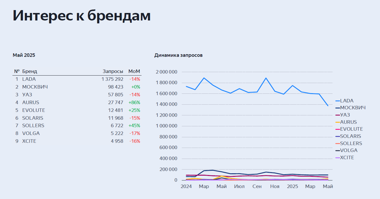 Эта динамика совпала со снижением интереса к марке: по данным Яндекса, в мае 2025 года количество поисковых запросов по LADA сократилось на 14%. Снижение спроса могло привести к перегреву аукциона Яндекс.Директ и росту ставок, что напрямую отразилось на стоимости лида. Таким образом, повышение CPL в мае мы связываем не только с ограниченной конверсионностью официального сайта, но и с внешними рыночными факторами.