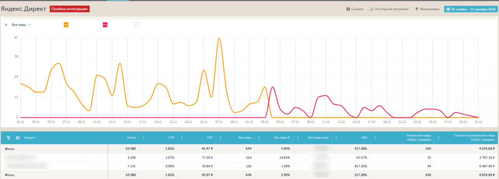 Анализ финансовых показателей подтвердил эффективность изменений: количество успешно закрытых рабочих листов выросло в 4 раза. Это говорит о том, что после смены посадочных страниц и корректировки рекламных кампаний не только увеличился объём лидов, но и заметно выросла рентабельность вложений в рекламу, что напрямую отразилось на продажах клиента.