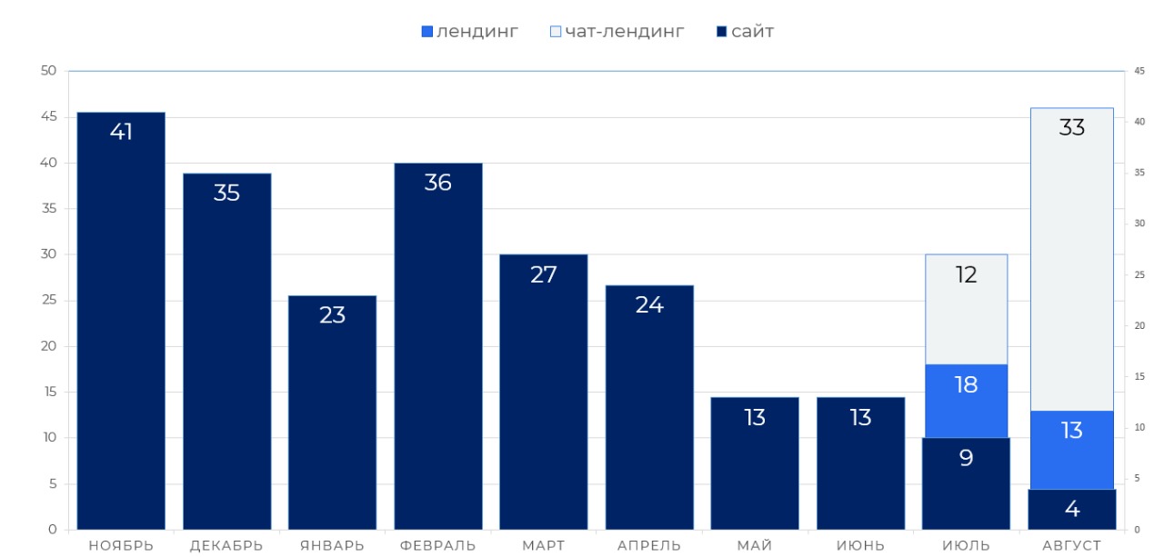 В августе динамика изменилась: лендинг снова принёс 20 лидов, но стоимость лида выросла до 5 256 ₽. Чат-лендинг, напротив, значительно усилил позиции: за месяц он обеспечил 42 лида при среднем CPL в 2 205 ₽, став основным источником обращений. Официальный сайт по-прежнему отставал: 5 лидов по 3 547 ₽.