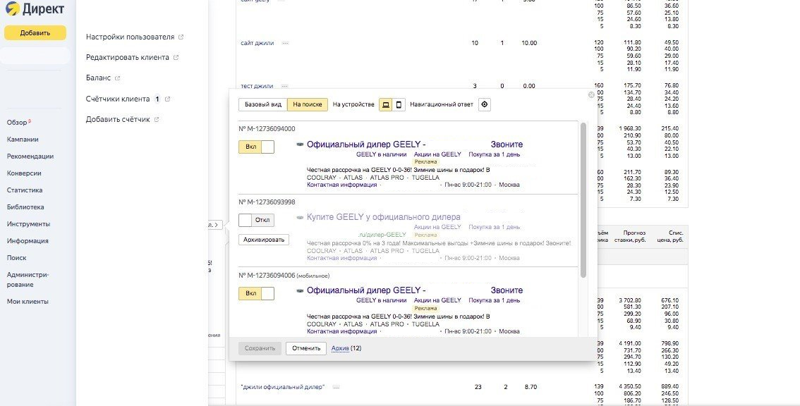 Начали работу с запуска стандартных кампаний на поиске и в сетях по модельным и безмодельным запросам с ручным управлением ставками. Аудитория максимально широкая: мужчины и женщины от 18 до 55+ лет. ГЕО: Москва и Московская область.