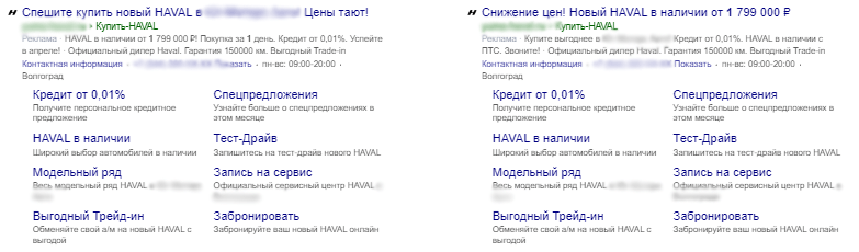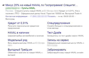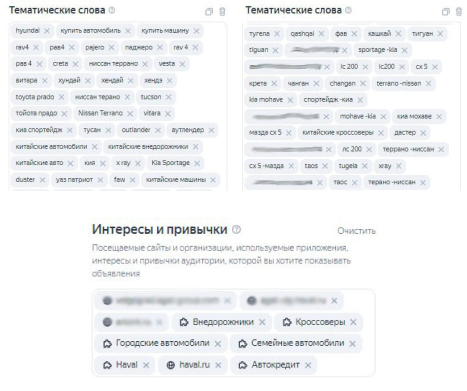 Для Госпрограммы мы добавили акционную кампанию в РСЯ. Да, до этого мы отключили РСЯ, но здесь цель была – получить хороший охват и привлечь внимание потенциальных клиентов к выгодным условиям приобретения Haval. Собрали семантику: «авто госпрограмма», «хавал распродажа», «хавал акции», «автокредит хавал», «хавал скидки», «машина госпрограмма», «хавал рассрочка», «хавал ф7 кредит» и др.