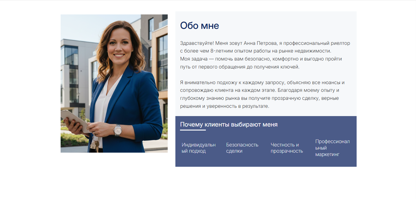 Это профессиональный шаблон сайта под ключ, созданный для персонального продвижения риелтора на рынке. В отличие от агрессивных лендингов, он работает на долгосрочное построение доверия через демонстрацию экспертизы, услуг и отзывов.