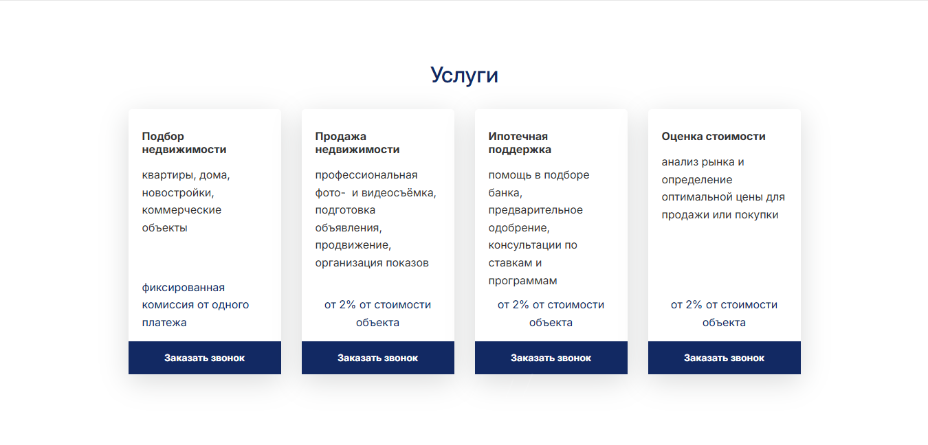 2. Подробный раздел «Услуги». Чёткое структурирование (подбор, продажа, ипотека, оценка) с описанием, фиксированными комиссиями и кнопками «Заказать звонок» у каждой услуги.